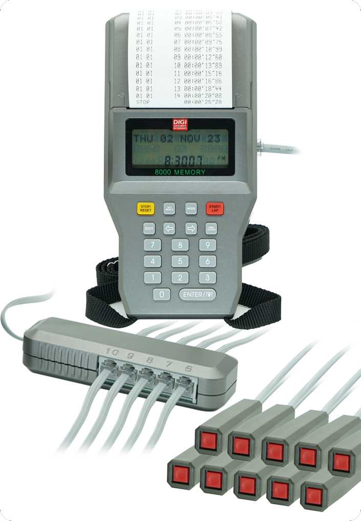 - 8000 Memories - Built-in PRINTER - Up to 10 Lane Buttons - PC Upload Function - 12/24Hr User-selectable Clock - 4-Digit Bib Number - 4-Digit Place Number - 4-Digit Lap Number - Auto Print Out - Print Final Result Function - Pre-Entry of Bib Numbers in Track Races - Single and Multi Start Times for Road Races - Maximum 99 Waves - Race Recall Function - Memory Clear Function - Printing Pause Function - Key Operation Sound - Battery powered main unit - Printer battery or AC power supplied (adaptor included)